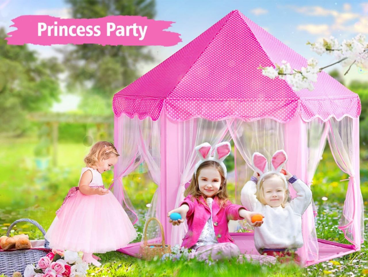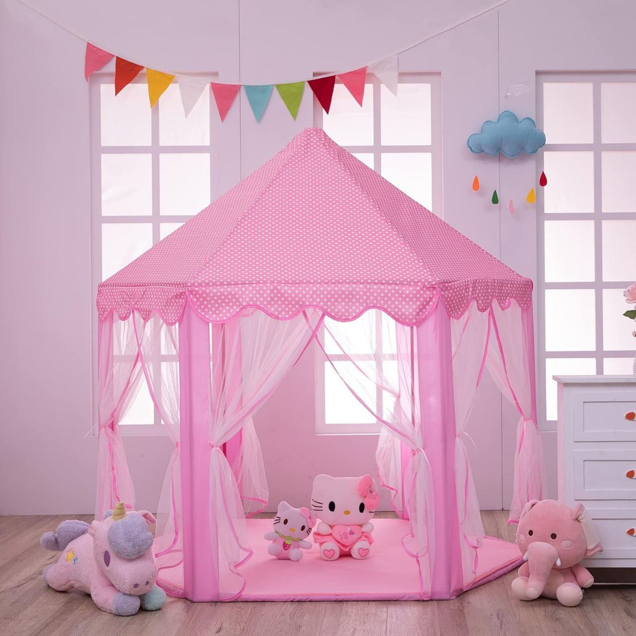 Offrez à votre enfant un espace magique pour jouer, lire ou rêver ! Cette tente château rose, facile à monter, crée une ambiance de princesse dans la chambre ou le salon.